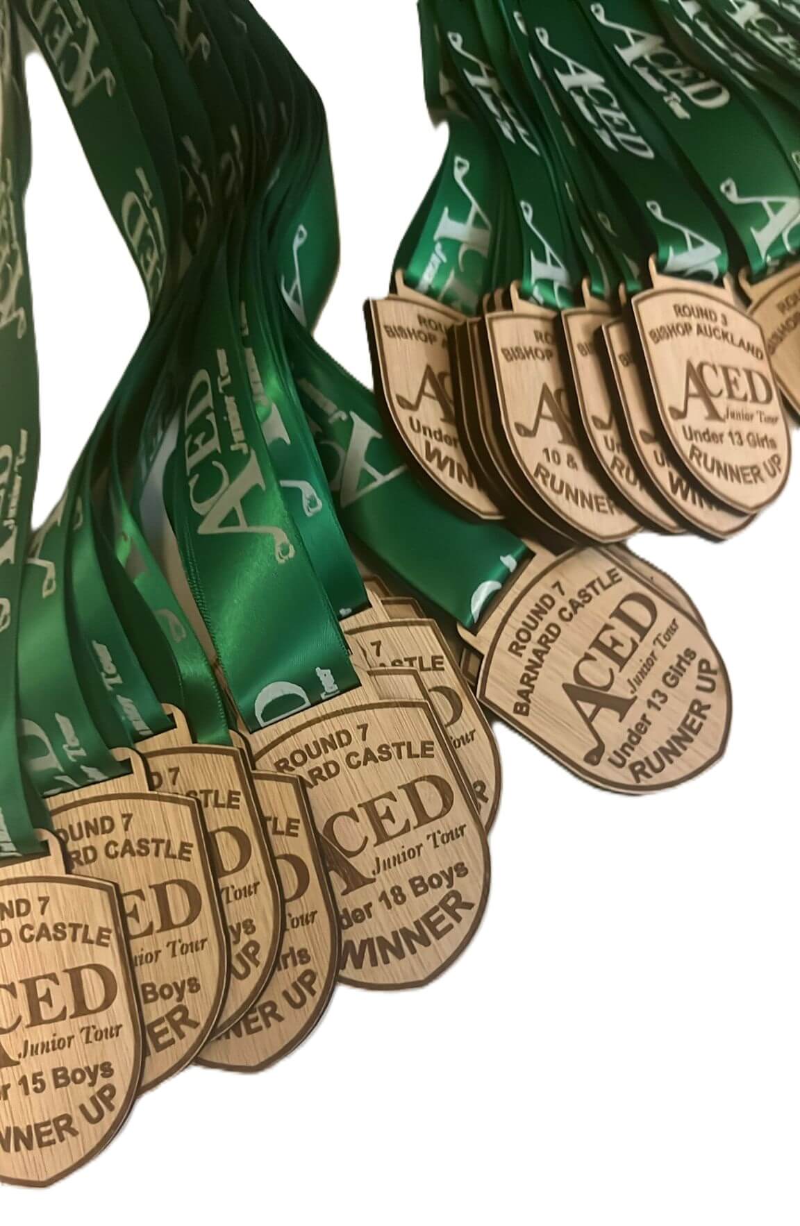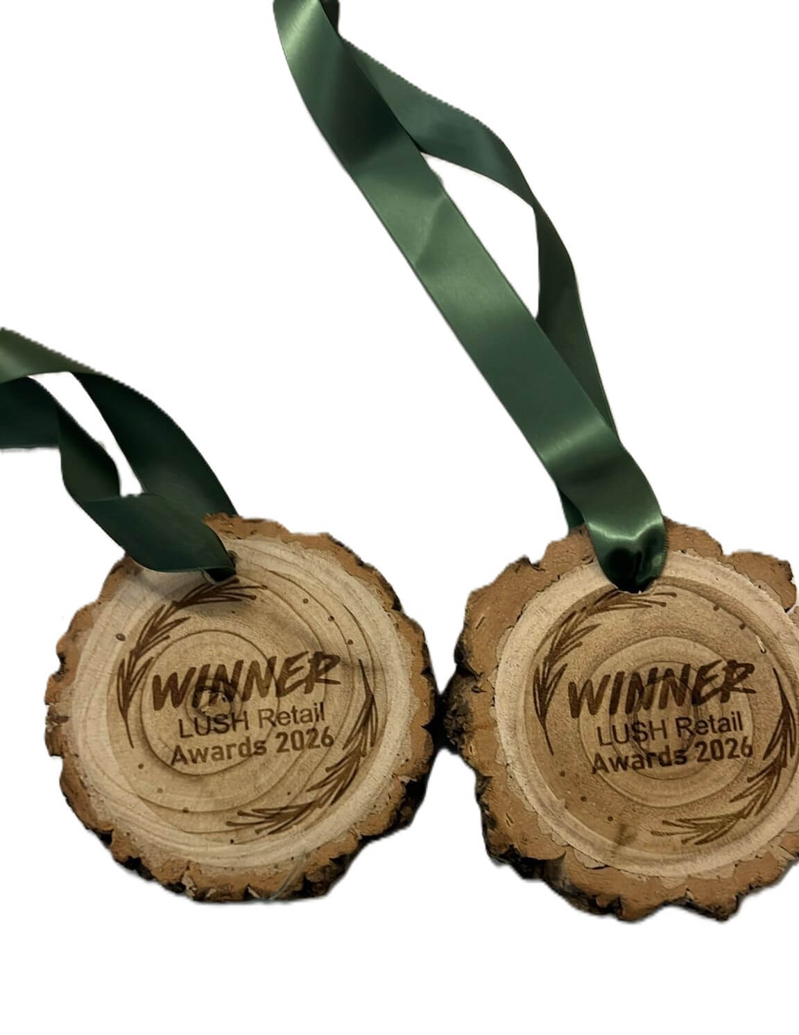 A group of wooden medals with green ribbons.