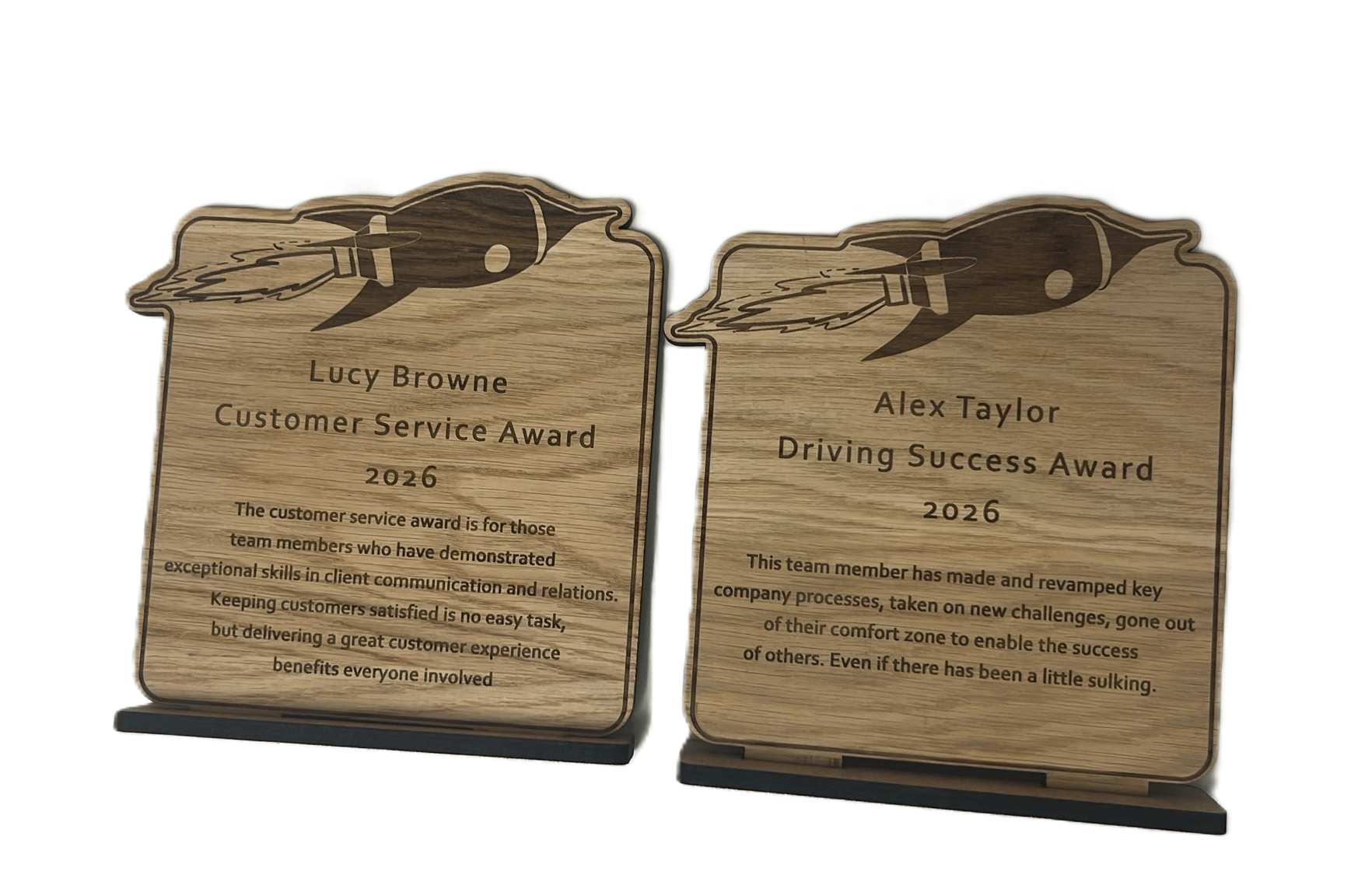 Wooden awards shaped like rockets with engraved text recognizing achievements. Awards titled Exceptional Listener Award and Customer Service Award for the year 2025 are visible, highlighting team engagement and customer satisfaction.