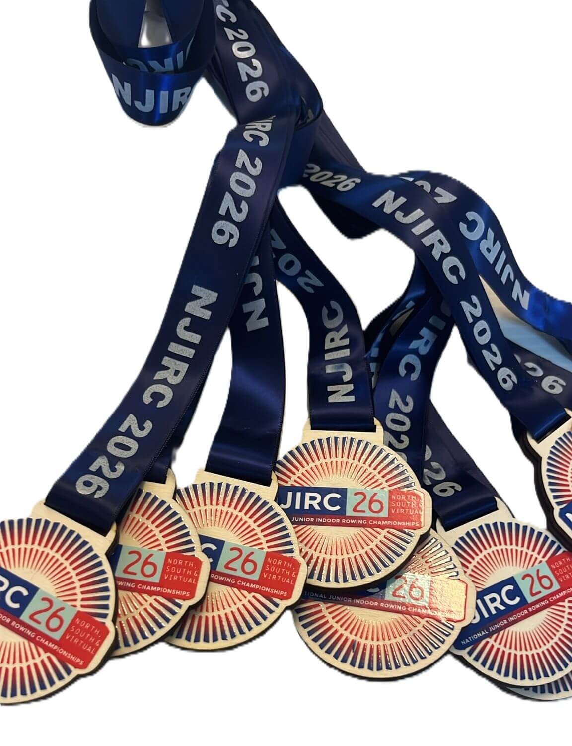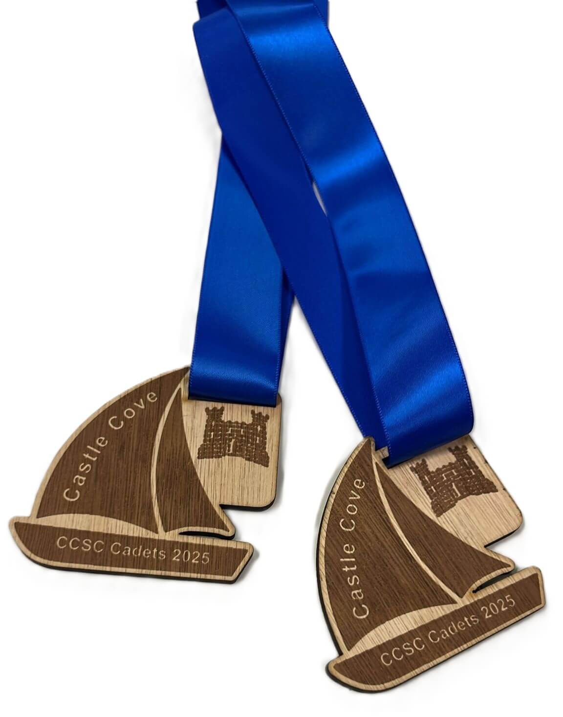 Close-up of wooden medals with blue ribbons, engraved with 2024 Club Champs, a shield emblem labeled S.R.A. and the word 2ND. The medals are stacked in an overlapping arrangement.