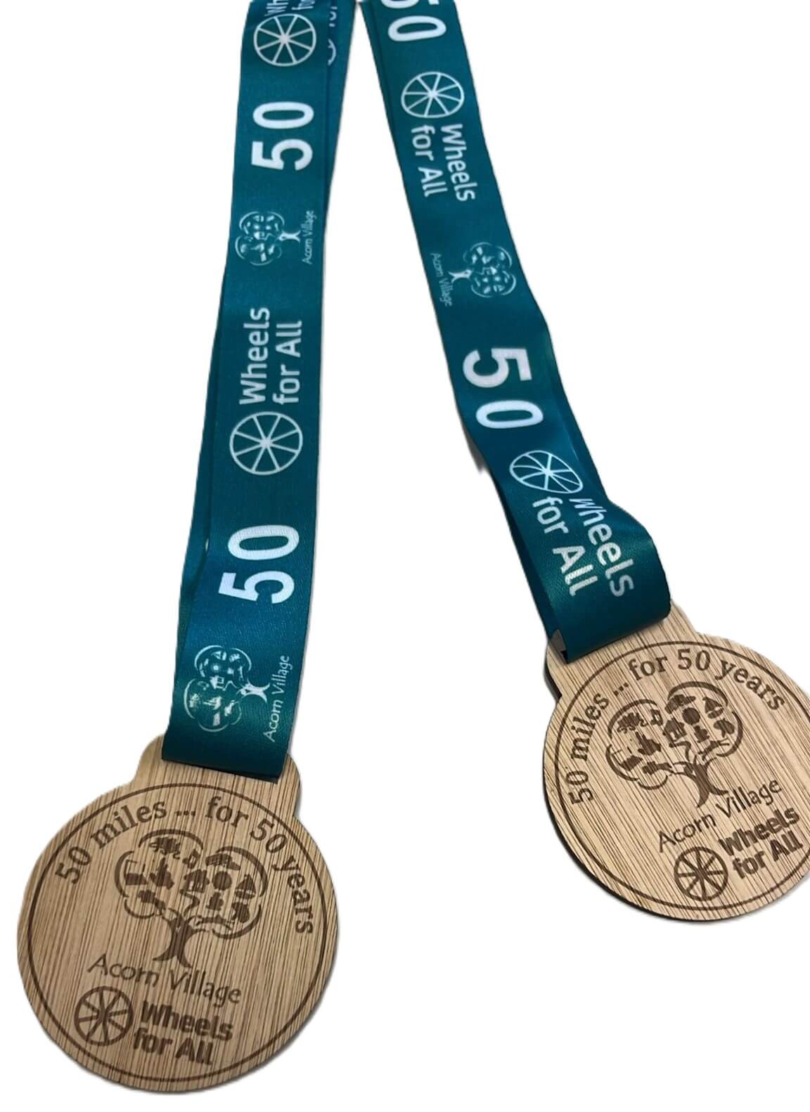 A close-up of wooden medals with teal ribbons. The medals are engraved with text for a relay event, 1 Mile Relay 6.22am – 7.22pm, and North Kensington Dawn Til Dusky 2, along with dates and a map outline.