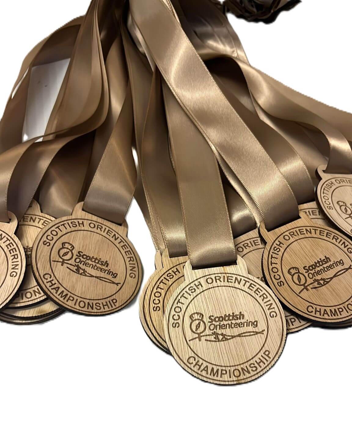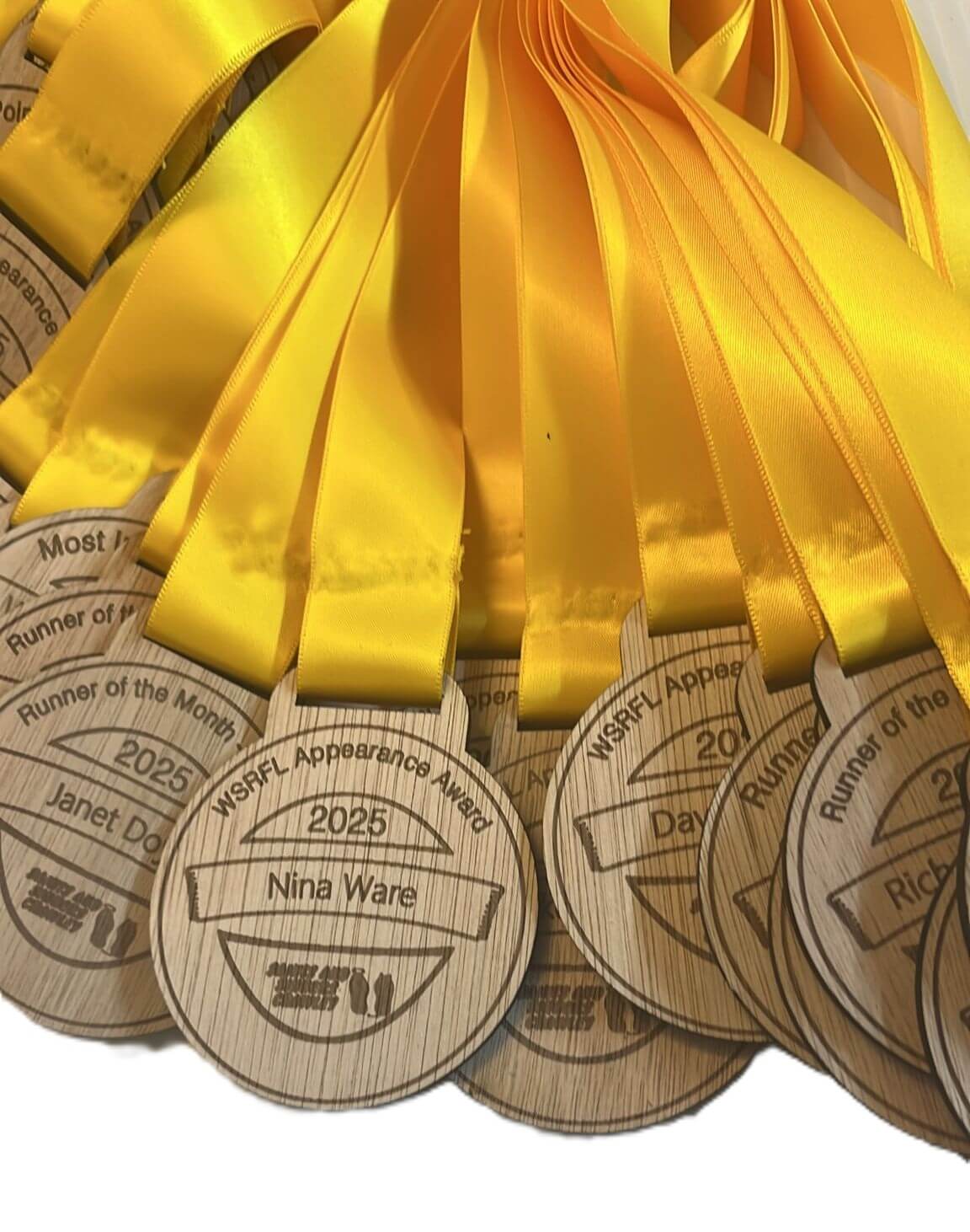 A group of wooden medals with yellow ribbons, each engraved with Scottish Enduro Series 2025 2nd SES, arranged in a fan shape on a white surface.