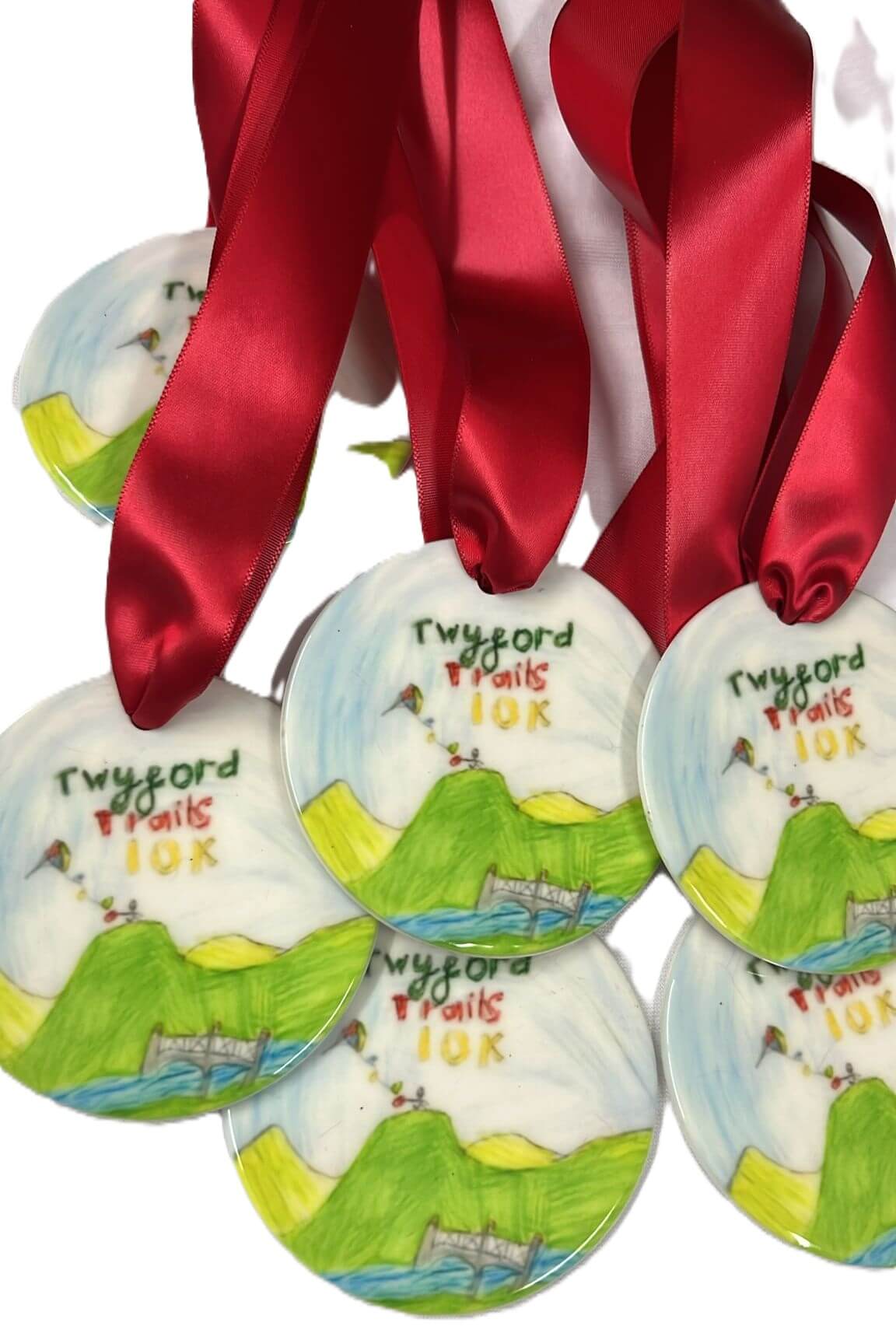 Santa run medals with red ribbons.