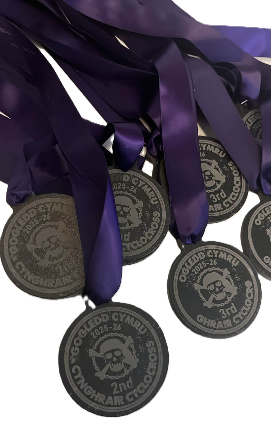 Several bronze medals with bright orange ribbons are displayed overlapping each other. The medals are engraved with Mini DH Glentress 2023, Cranked Cycle Club, and placings for 1st, 2nd, and 3rd place.