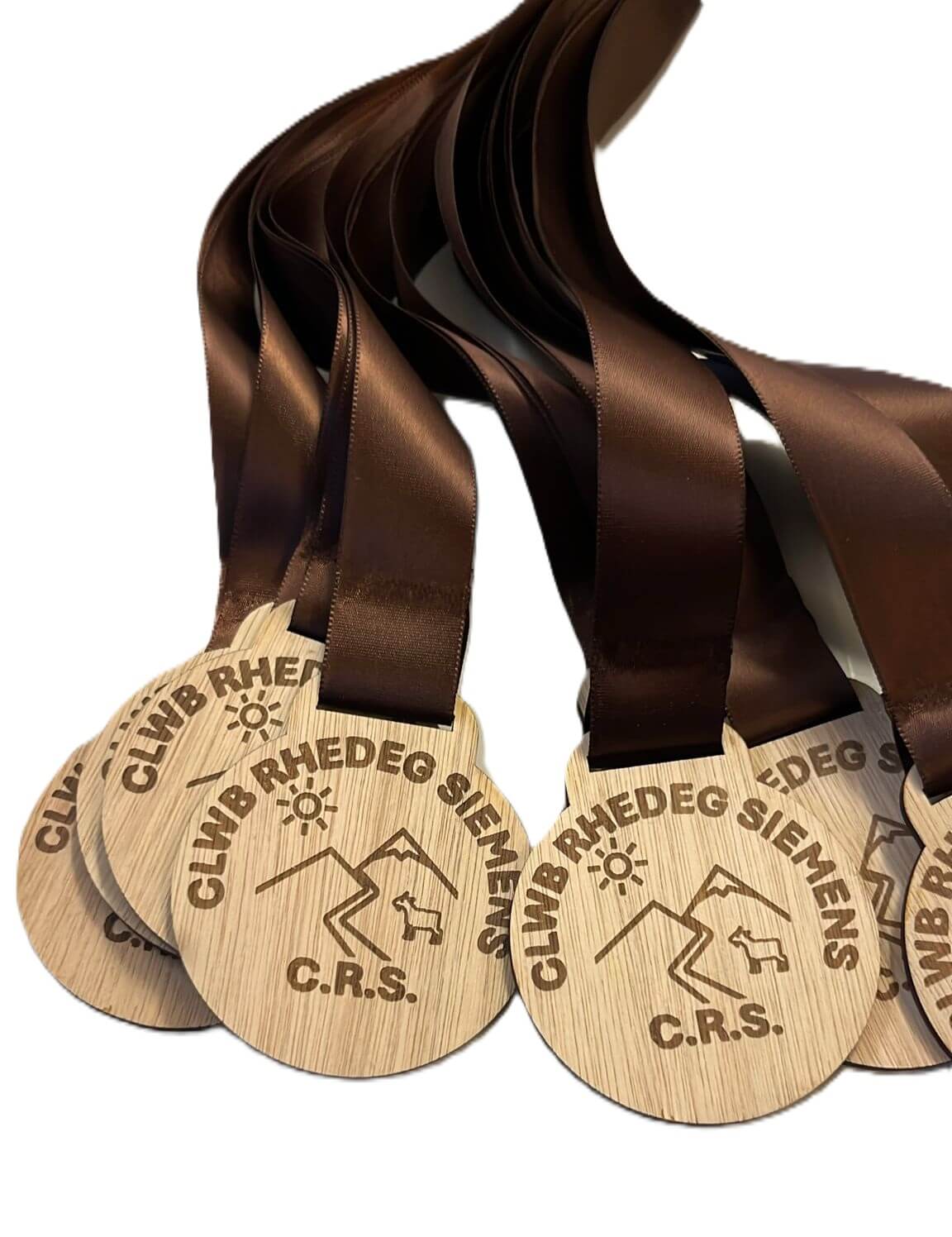 A group of wooden medals with Cheadle Running Club engraved on them, attached to dark blue ribbons that also say Cheadle Running Club in white text. The medals are arranged on a white surface.