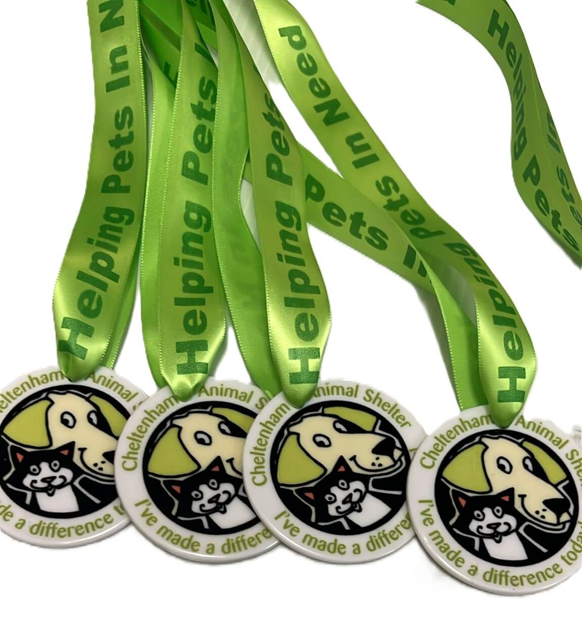Two round medals with green ribbons that say Helping Pets in Need. The medals feature cartoon images of a dog and a cat and read, Cheltenham Animal Shelter—I’ve made a difference today!.