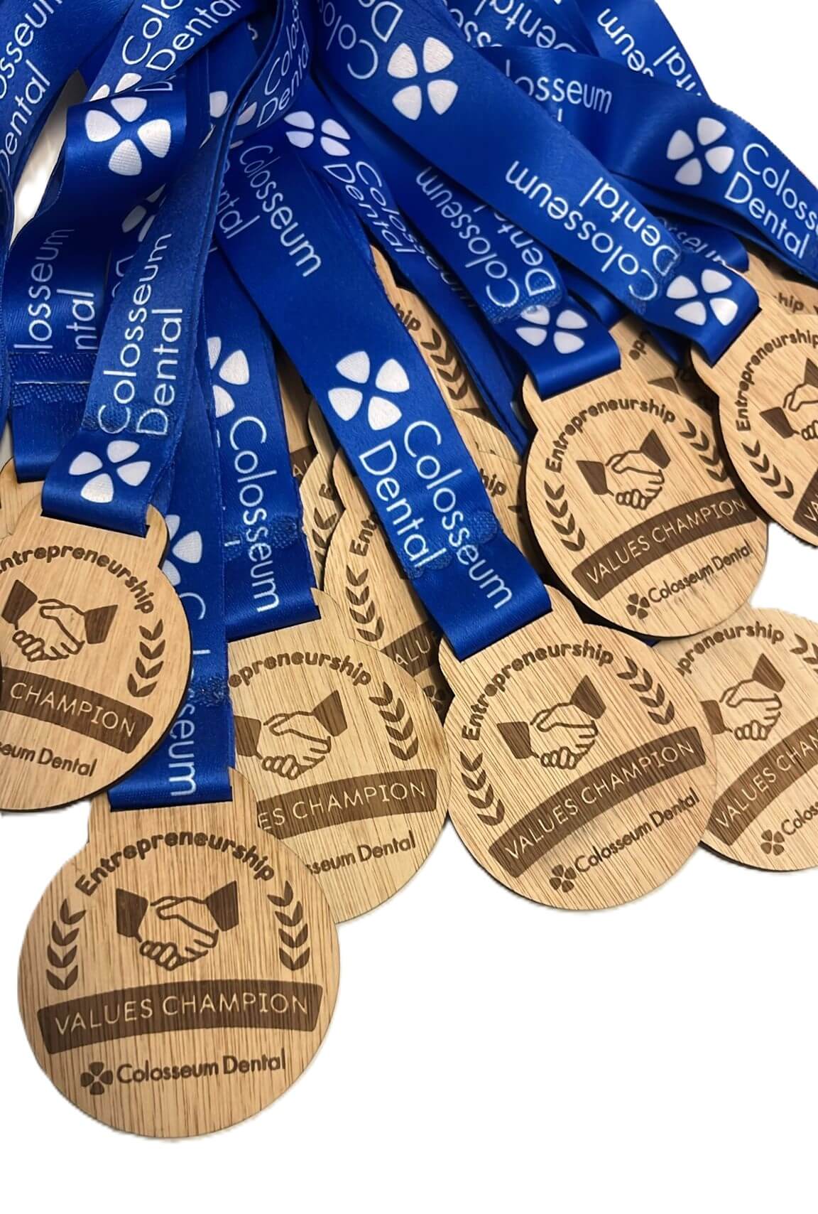 A group of wooden medals with blue ribbons, each featuring a stylised M inside a circle engraved on the front. The medals are overlapping and arranged in a fan-like formation.