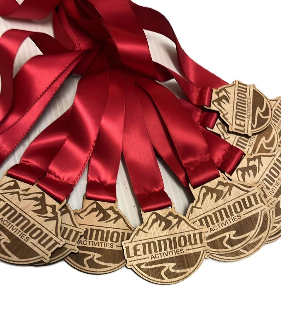 A group of eco-friendly medals crafted from wood, each featuring a vibrant red ribbon.