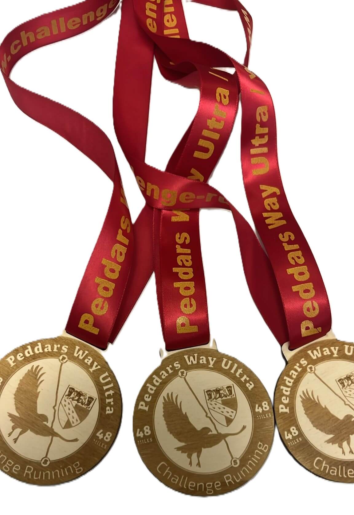 Several wooden medals with The River Tay Way 2025 engraved on them are shown. The medals have red and purple ribbons labelled 2025 ULTRA and 2025 TEAM respectively, arranged on a white surface.