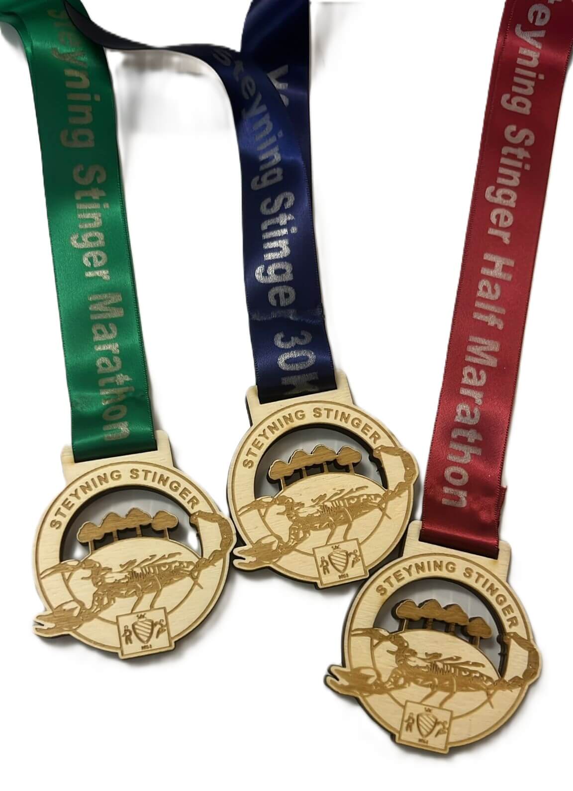 A close-up of several eco-friendly medals, each crafted from wood and engraved with a stylised M, attached to dark blue ribbons.