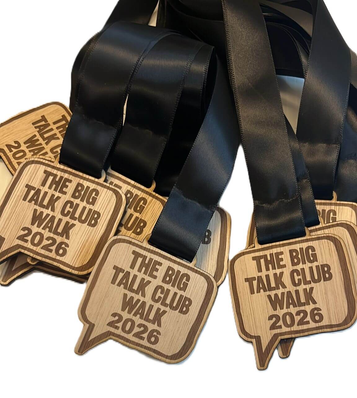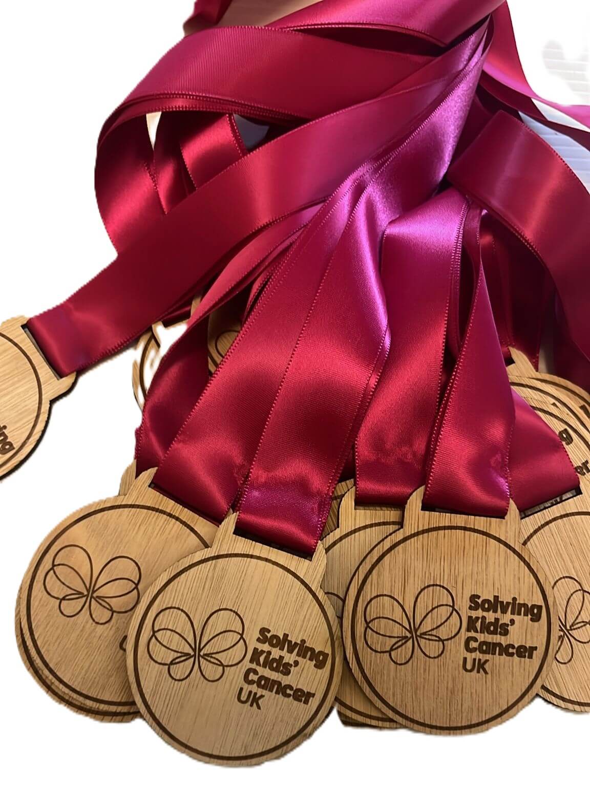 A group of wooden medals with Le Cure 2025 written in pink on the front. Each medal hangs from a bright pink ribbon with white writing and logos. The medals are arranged overlapping on a light surface.