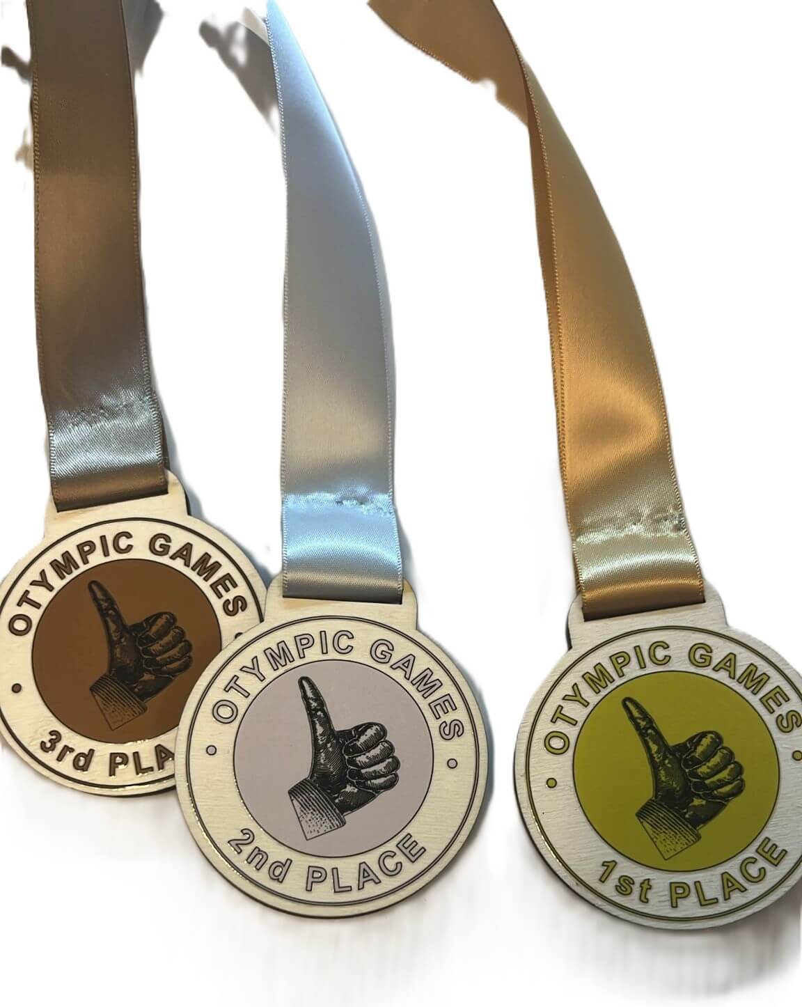 Three wooden medals with orange ribbons.