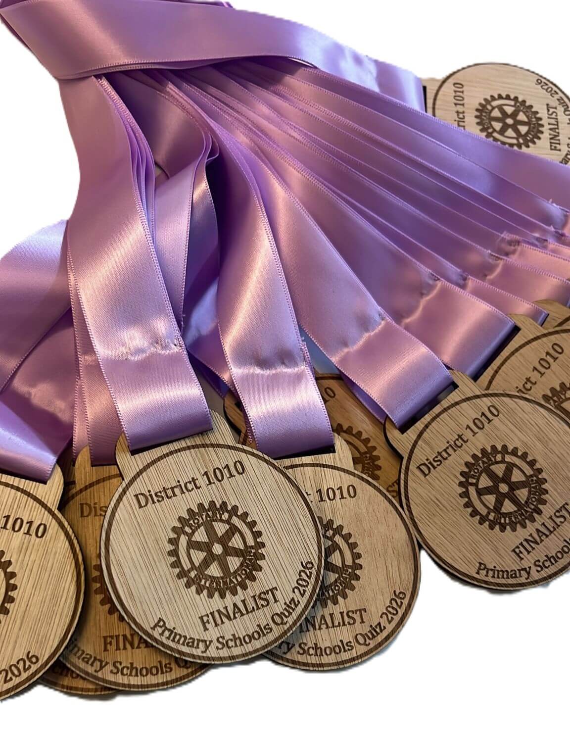 Wooden medals with the Rotary International logo and FINALIST Primary Schools Quiz 2023, District 1010 engraved on them, are displayed with purple ribbons attached, laid out on a white surface.