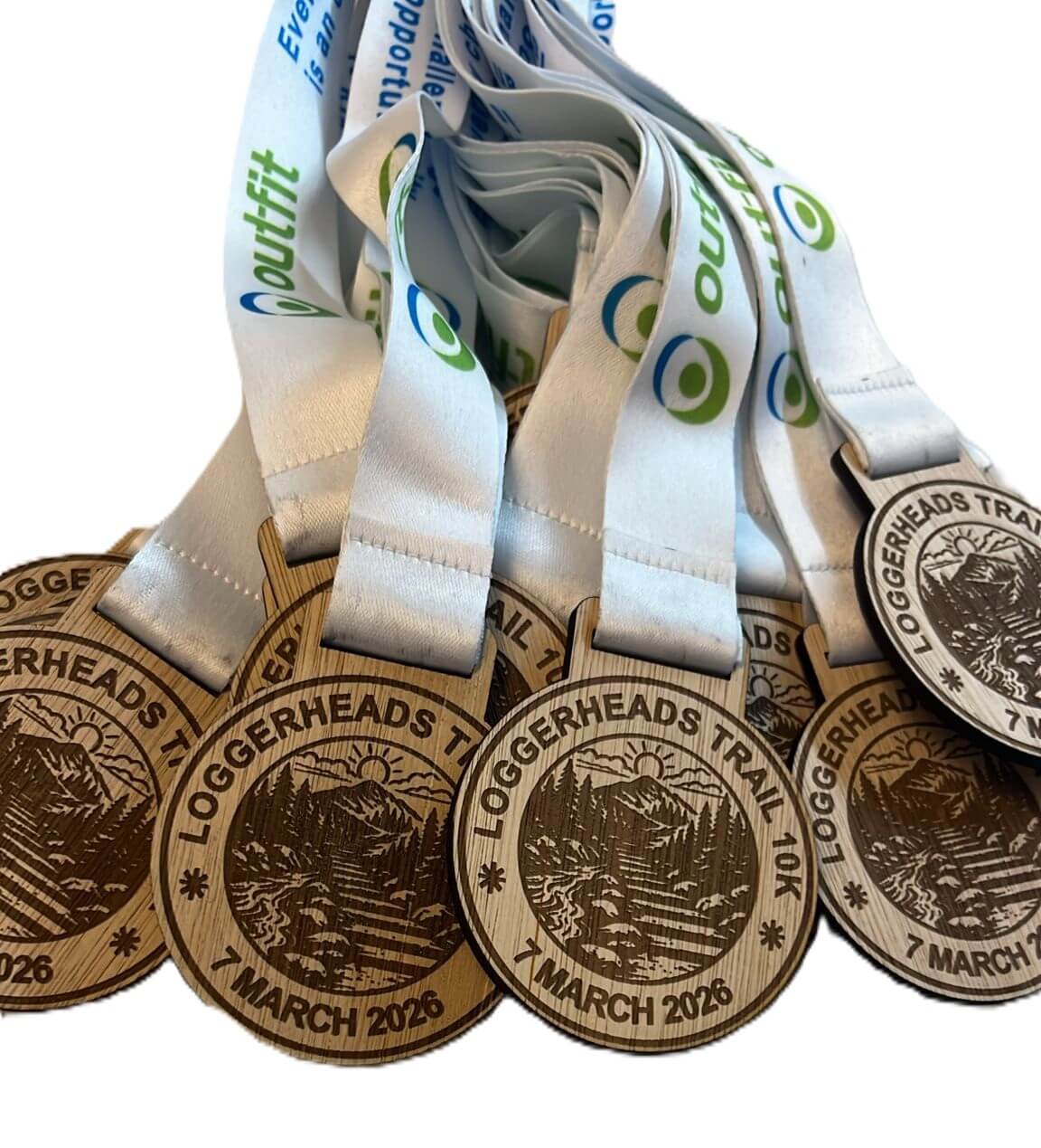A pile of wooden medals with blue ribbons, engraved with BRADNINCH BOLT 2025 and a footprint design, arranged on a white surface.